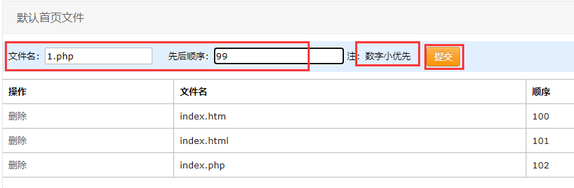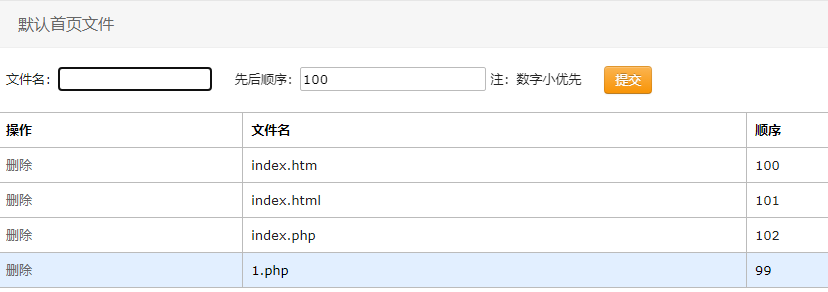 4,例,我们要添加1.php 为默认首页,按以下操作。(注:先后顺序数字越小,优先级越高)